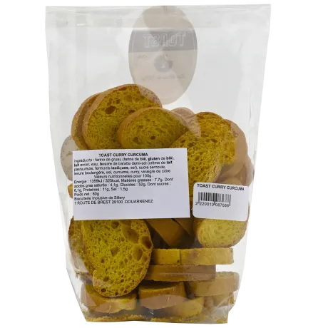 Des toasts faits main en Bretagne, une fabrication très artisanale pour des toasts croustillants aux saveurs chaudes et exotiques grâce aux épices. Ils sont parfaits pour apporter de la couleur et du croustillant à vos toasts de rillettes de poissons et de crustacés : une invitation au voyage !