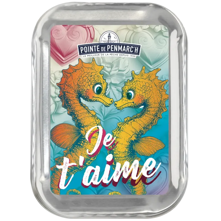 Saviez-vous que les conserves de sardines se collectionnent ? C’est le moment de vous lancer avec cette boîte événementielle « Je t’aime » et son décor hippocampe ! Les collectionneurs passionnés préfèrent garder les boîtes pleines, mais vous pouvez aussi la garder vide, après vous être régalé de son contenu. Ce joli décor est tout spécialement adapté pour faire un cadeau à quelqu’un à qui vous tenez particulièrement. Ce sera assurément un cadeau original qui fera très plaisir à l’heureux(se) élu(e) !